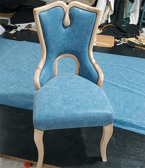 椅子的椅帽頭里“皇冠”造型,且椅帽頭的正前面的凸起 “珍寶” 狀配飾,增加了很大工藝難度,比常規(guī)椅子既耗費材料,又耗費工時。