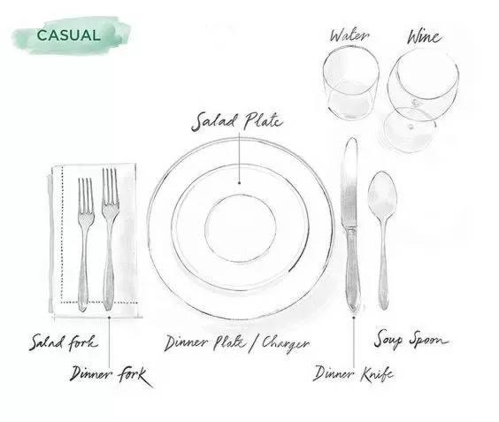 首先談談餐桌的布局。如今美國大多數的餐館(甚至包括一些米其林三星的餐館)都更崇尚簡約隨意的風格。非正式的餐桌布局如下面這張圖所示: