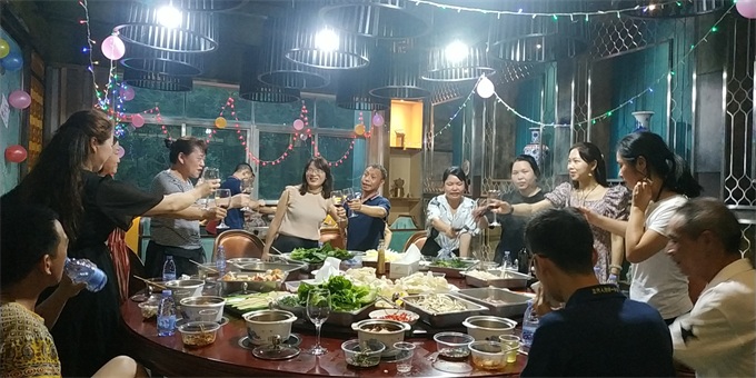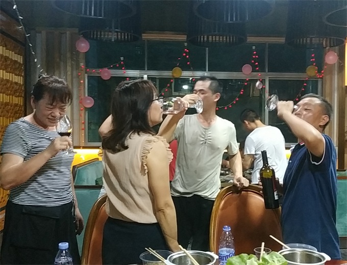 下午六點(diǎn),一切準(zhǔn)備工作就緒,所有嘉賓媽媽們已經(jīng)到場(chǎng),這時(shí)投影儀開始播放嘉賓視頻,感人的背景音樂加上精心的視頻剪輯讓每個(gè)媽媽及在場(chǎng)人員都為之動(dòng)情!這時(shí)大家也許想到最多的就是自己的母親……音樂停止,大家的思緒也被拉回了現(xiàn)場(chǎng),總經(jīng)理谷先生邀請(qǐng)?jiān)趫?chǎng)所有媽媽們合影留念,大家盛裝打扮,每個(gè)媽媽都是那么漂亮耀眼!接下來,大家就坐,共同舉杯慶祝,并享受美味的火鍋。所有在場(chǎng)男士都非常紳士的給媽媽們敬酒,媽媽們也毫不遜色的干杯、一飲而盡!氣氛非常的融洽且舒適,干部桌很多男士,喝著從家鄉(xiāng)帶來的米酒,一杯又一杯,根本停不下來!也許他們喝的不是酒,而是思鄉(xiāng)的情懷!