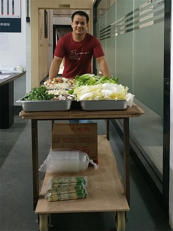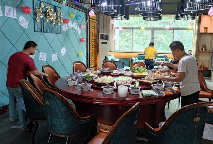 菜品很快被木工車間邱主管推了上來,只見他步伐輕盈,微笑的向包間走來,那表情和動(dòng)作真的可以媲美專業(yè)酒店服務(wù)員了!大家一起幫忙,很快菜就擺上了火鍋?zhàn)溃總€(gè)小鍋都加上了火鍋底料,香氣四溢,讓人有忍不住吞口水的沖動(dòng)!