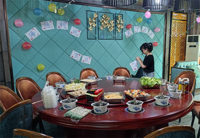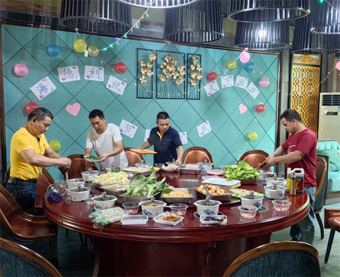 海德利有一個(gè)不同于其他企業(yè)的地方,就是擁有屬于自己的大展廳和很多裝修奢華的包間,包間里成列著不同風(fēng)格的餐桌椅,因此我們這次活動(dòng)決定就地取材,在自己的電動(dòng)火鍋?zhàn)腊g開展。首先人力和行政進(jìn)行活動(dòng)的前期籌備:統(tǒng)計(jì)人員、列菜單、場(chǎng)景布置、道具準(zhǔn)備、人員分配及調(diào)度。接著推廣部、生產(chǎn)部也參與其中,推廣部很貼心的為每位媽媽拍攝工作視頻,制作成溫馨、感人的視頻。生產(chǎn)部由廠長(zhǎng)帶隊(duì),將展品火鍋?zhàn)雷優(yōu)榭梢跃筒偷碾妱?dòng)火鍋?zhàn)馈8鞑块T緊密配合,籌備活動(dòng)進(jìn)行的非常順利。